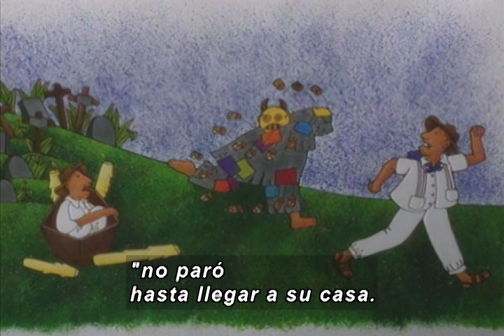 El primero volteaba y veía que lo perseguían. No paro hasta llegar a su casa. Y se aventó en una hamaca, temblando de miedo. El segundo, para escapar del diablo, se escondió en la misma hamaca. El diablo con el susto no vio que el muerto iba delante de él y se lo fue a encontrar en la misma hamaca.